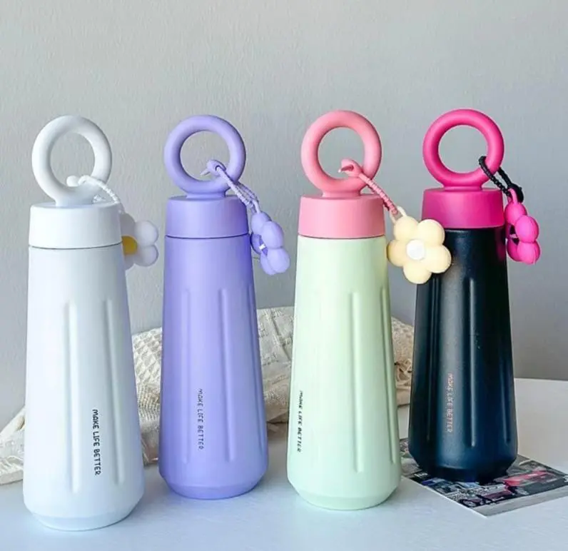 • BOTOL TUMBLER STAINLESS SEMI CONE 450 ML DENGAN TUTUP PUTAR DAN GANTUNGAN KELOPAK BUNGA
