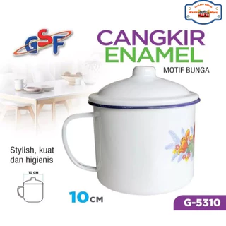 MUG ENAMEL GSF MOTIF BUNGA DENGAN LIS BIRU DAN TUTUP PUTIH DIAMETER 10 CM
