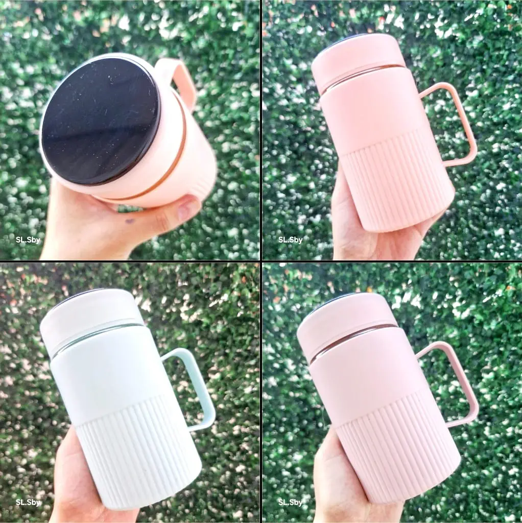 MUG KACA DENGAN OUTER PLASTIK MOTIF GARIS VERTIKAL DAN TUTUP HITAM TRAPEZIUM