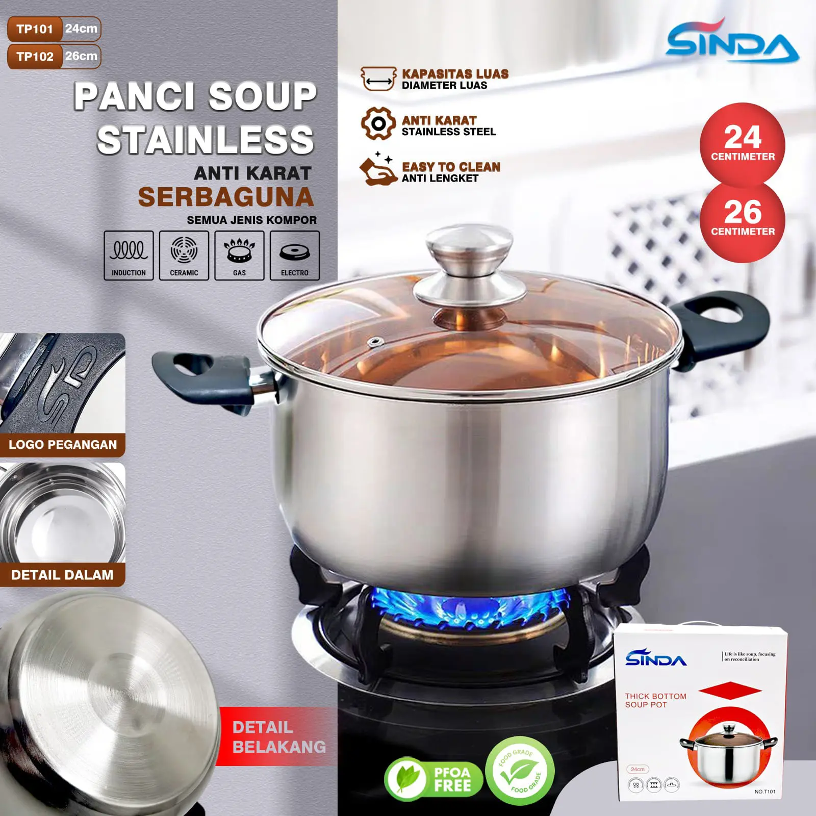 PANCIO SOUP STAINLESS ANTI KARAT 26 CM DENGAN TUTUP TRANSPARAN DAN PEGANGAN KUIPING