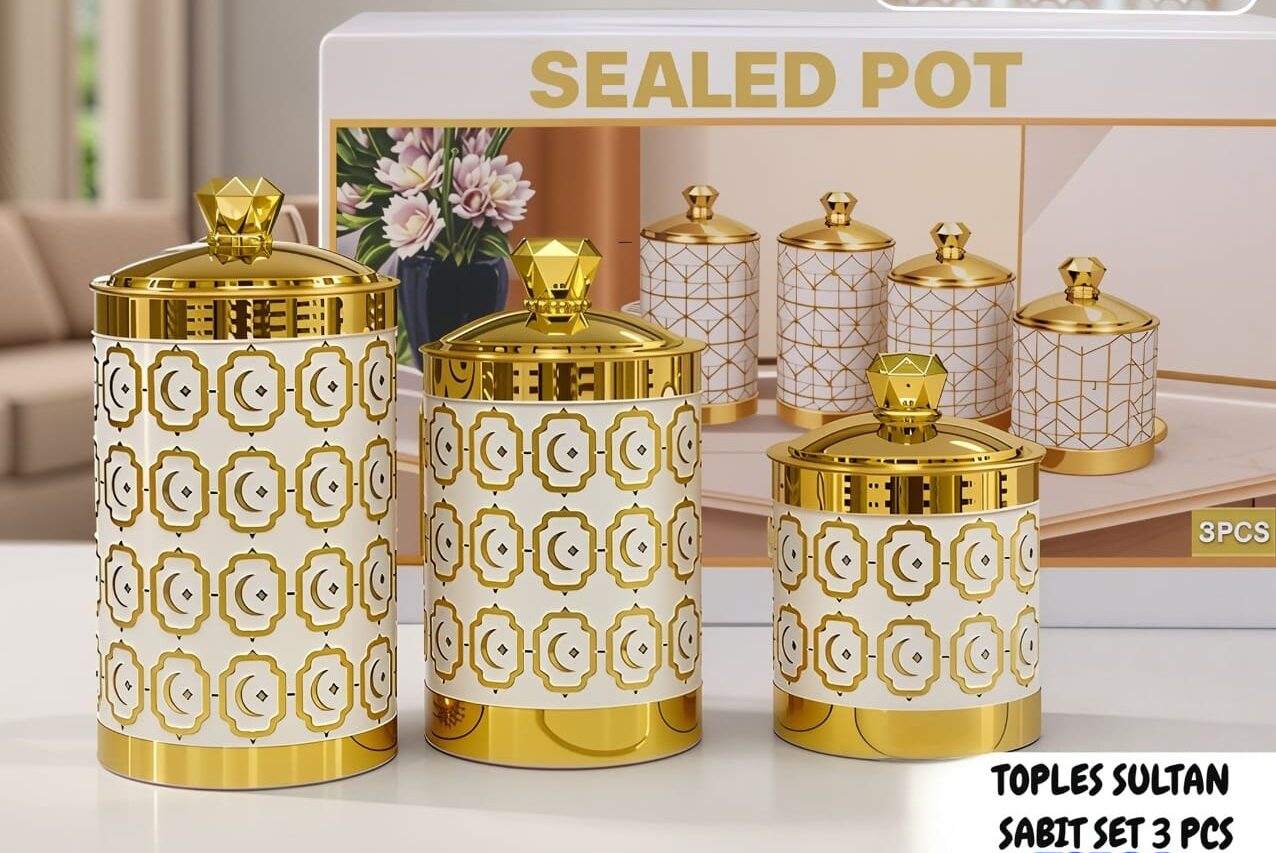 Simpan momen berharga Anda dengan toples plastik elegan ini! Set 3 ukuran (500 ml, 800 ml, 1000 ml) hadir dengan desain motif bulan bintang serta bingkai emas yang memikat. Pegangan tutup diamond memudahkan akses, menjadikannya pilihan ideal untuk menyimpan kue Lebaran atau camilan sehari-hari. Bergaya dan fungsional, sempurna untuk menambah estetika dapur Anda!