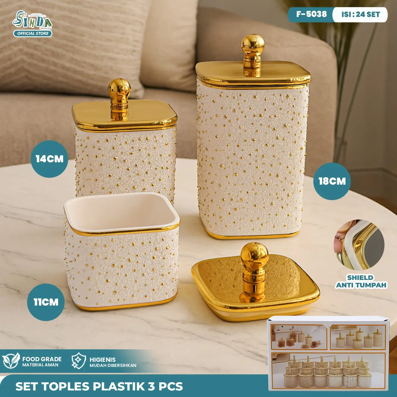 Rayakan Lebaran dengan toples stylish ini! Set 3 in 1 dengan desain segi empat motif sprinkle dan tutup metalik gold yang elegan. Ideal untuk menyimpan kue kering, camilan, atau hidangan khas Lebaran lainnya. Tersedia dalam tiga ukuran (11 cm, 14 cm, 18 cm) untuk memenuhi segala kebutuhan Anda. Tambahkan sentuhan glamour pada meja saji Anda!