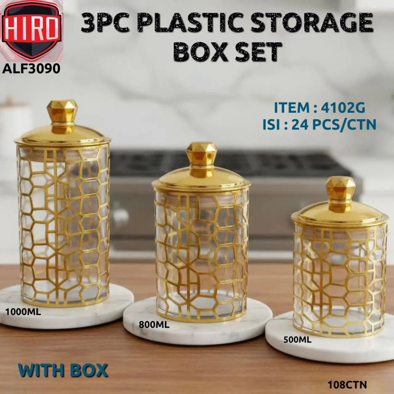 Simpan dan tampilkan makanan dengan gaya menggunakan toples plastik set ini! Tersedia dalam 3 ukuran (500ml, 800ml, 1000ml), desain bingkai emas geometrik yang elegan dan pegangan tutup diamond menjadikan penyimpanan Anda semakin menarik. Ideal untuk menjaga kesegaran camilan, bumbu, atau bahan makanan. Fashionable dan fungsional, sempurna untuk dapur modern Anda!